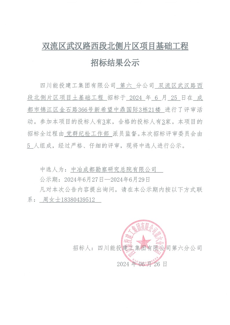 双流区武汉路西段北侧片区项目基础工程结果公示