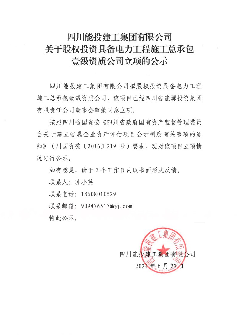 关于股权投资具备电力工程施工总承包壹级资质公司立项的公示