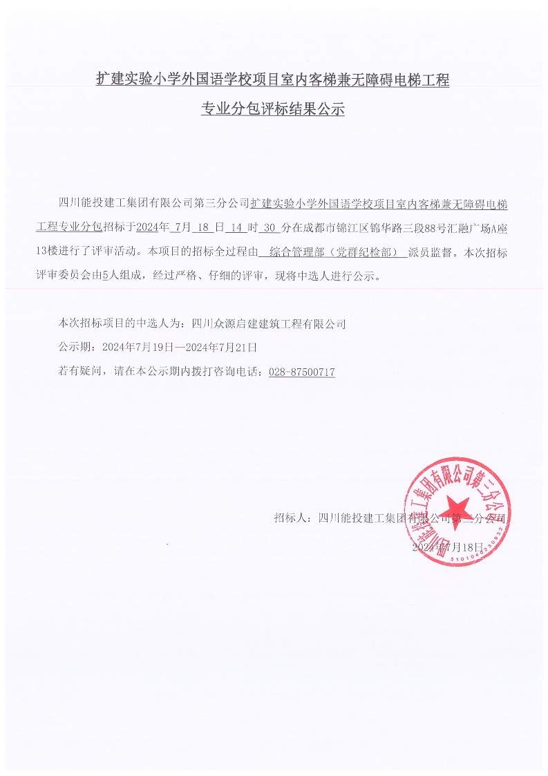 扩建实验小学外国语学校项目室内客梯兼无障碍电梯工程专业分包结果公示