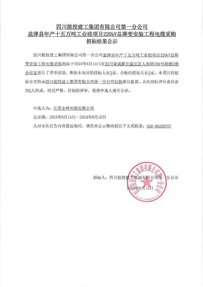 盐津县年产十五万吨工业硅项目220kV总降变安装工程电缆结果公示
