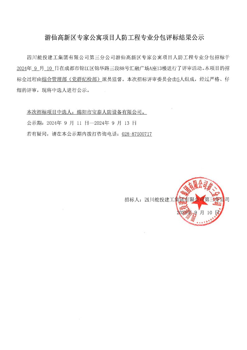 游仙高新区专家公寓项目人防工程专业分包结果公示