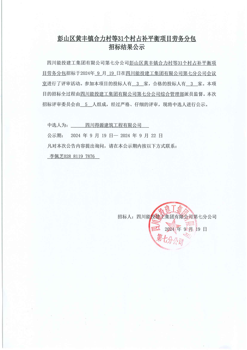 彭山区黄丰镇合力村等31个村占补平衡项目劳务分包结果公示