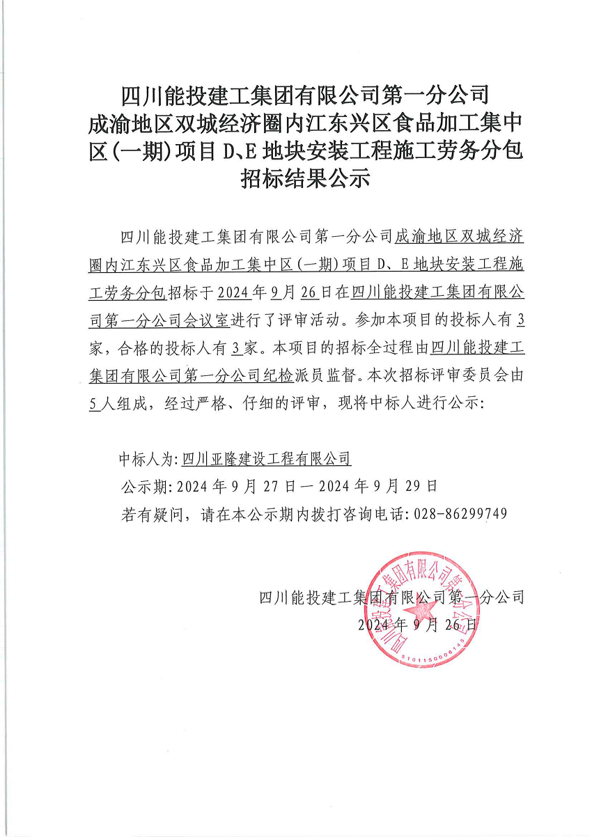 成渝地区双城经济圈内江东兴区食品加工集中区(一期)项目D、E地块安装工程施工劳务分包招标结果公示