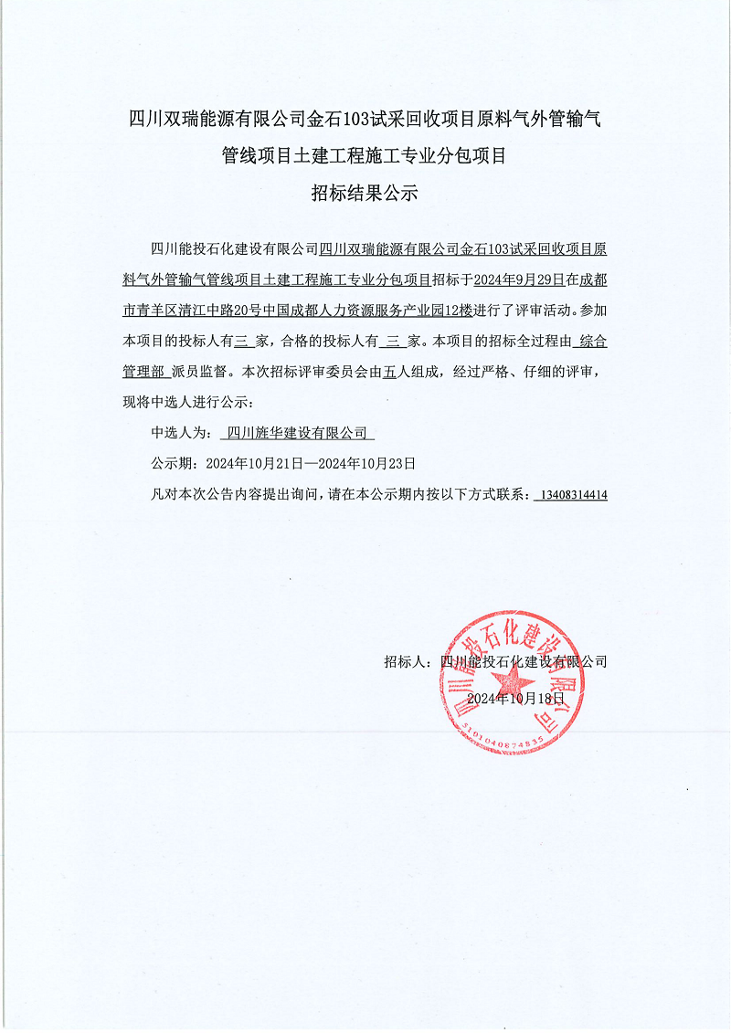 四川双瑞能源有限公司金石103试采回收项目原料气外管输气管线项目土建工程施工专业分包项目招标结果公示