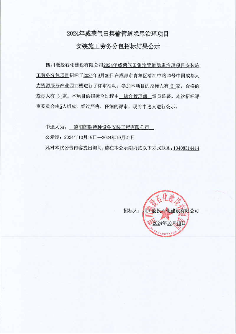 2024年威荣气田集输管道隐患治理项目安装施工劳务分包招标结果公示