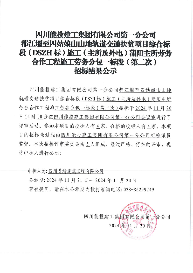 都江堰至四姑娘山山地轨道交通扶贫项目综合标段(DSZH标)施工(主所及外电)蒲阳主所劳务合作工程施工劳务分包一标段(第二次)招标结果公示