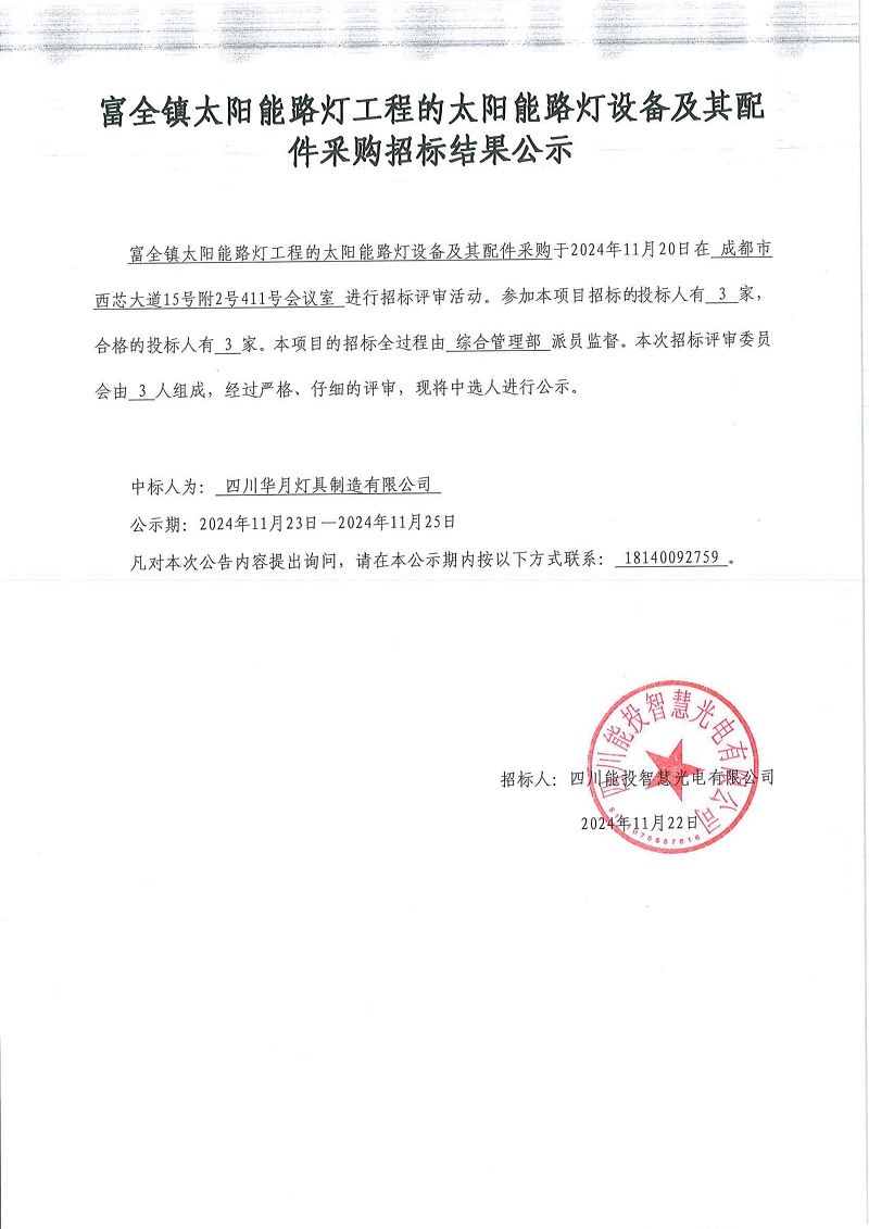 富全镇太阳能路灯工程太阳能路灯设备及其配件采购招标结果公示