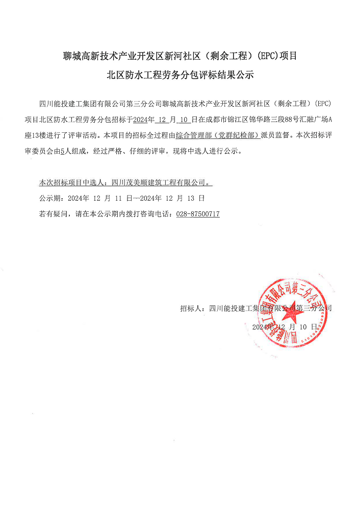 聊城高新技术产业开发区新河社区(剩余工程)(EPC)项目北区防水工程劳务分包评标结果公示