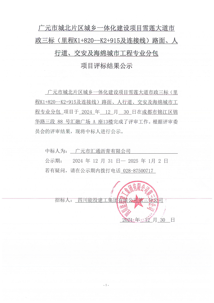 广元市城北片区城乡一体化建设项目雪莲大道市政三标(里程K1+820--K2+915及连接线)路面、人行道、交安及海绵城市工程专业分包项目评标结果公示