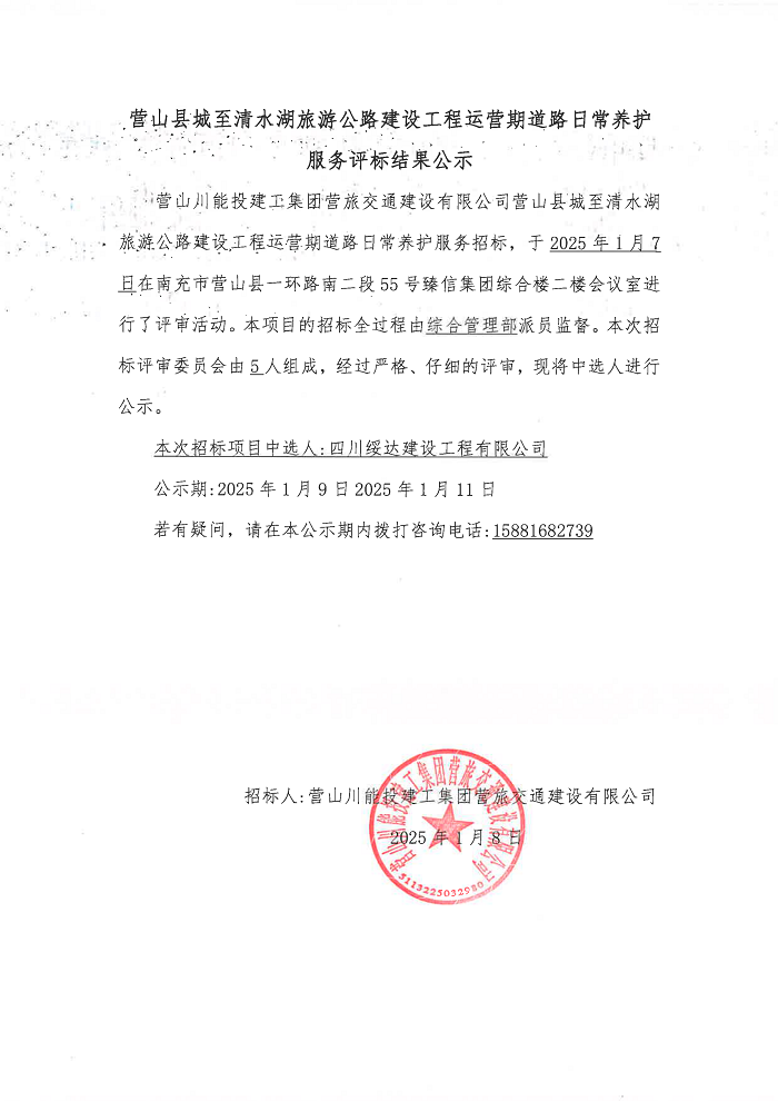 营山县城至清水湖旅游公路建设工程运营期道路日常养护服务评标结果公示