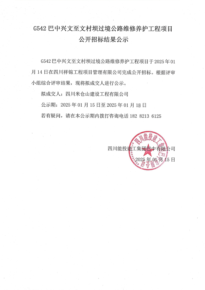 G542巴中兴文至文村坝过境公路维修养护工程项目公开招标结果公示