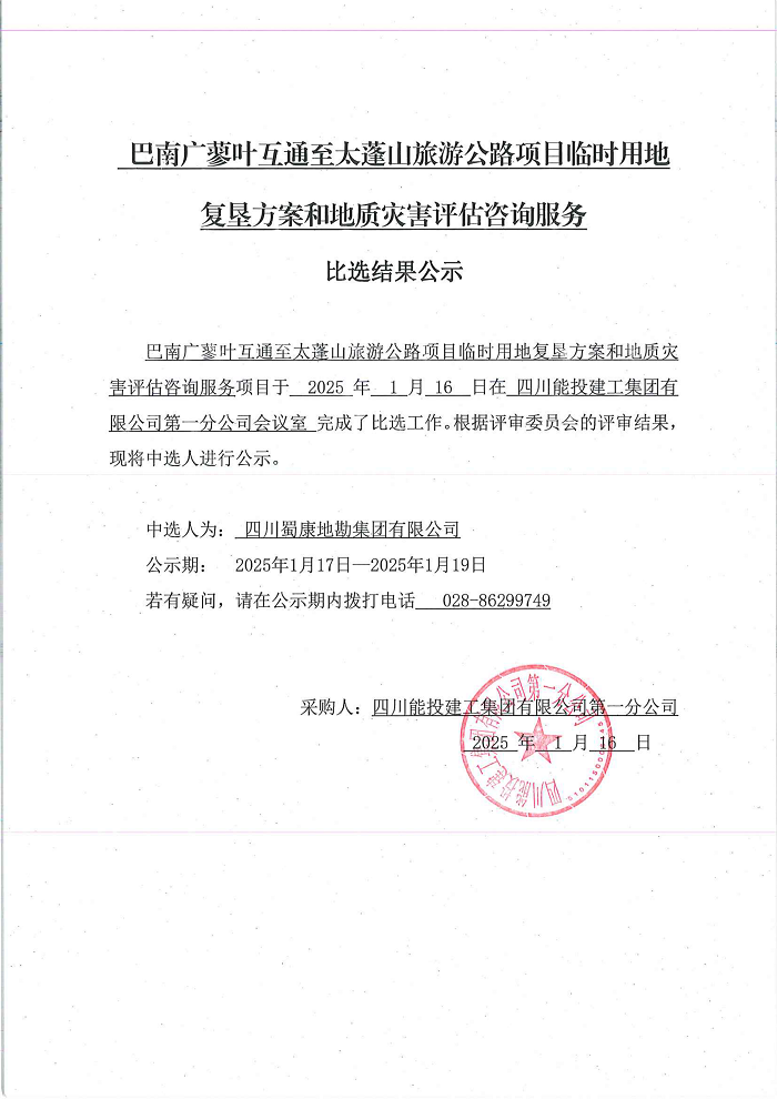 巴南广蓼叶互通至太蓬山旅游公路项目临时用地复垦方案和地质灾害评估咨询服务比选结果公示