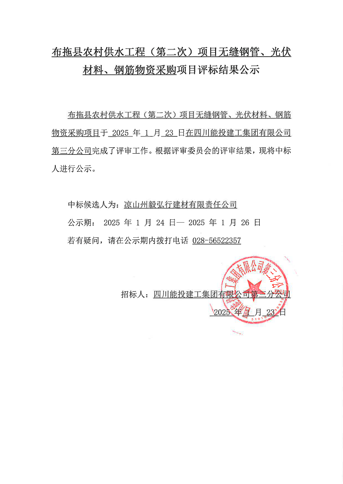 布拖县农村供水工程(第二次)项目无缝钢管、光伏材料、钢筋物资采购项目评标结果公示