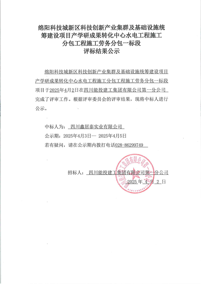 上一条:绵阳科技城新区科技创新产业集群及基础设施统筹建设项目产学研成果转化中心水电工程施工分包工程施工劳务分包二标段评标结果公示