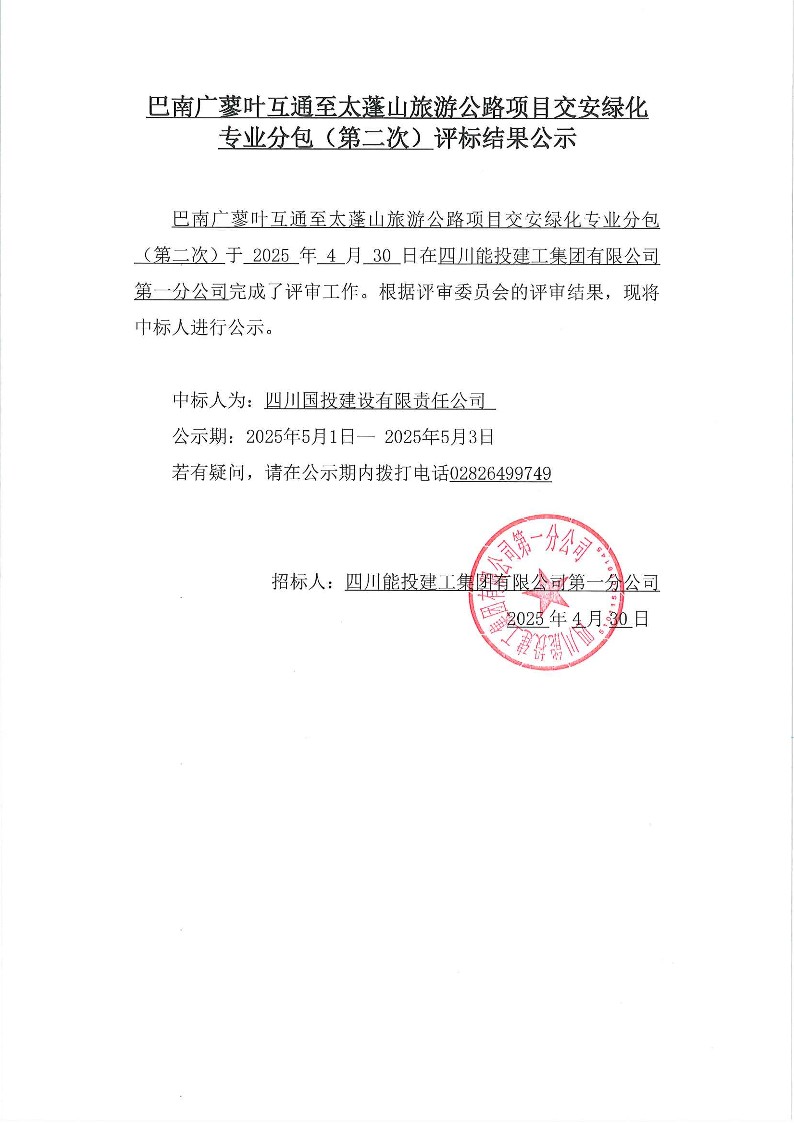 巴南广蓼叶互通至太蓬山旅游公路项目交安绿化专业分包(第二次)结果公示