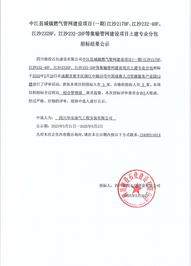 下一条:中江县城镇燃气管网建设项目(一期)江沙217HF、江沙232-4HF、江沙232HF、江沙232-2HF等集输管网建设项目安装施工劳务分包结果公示