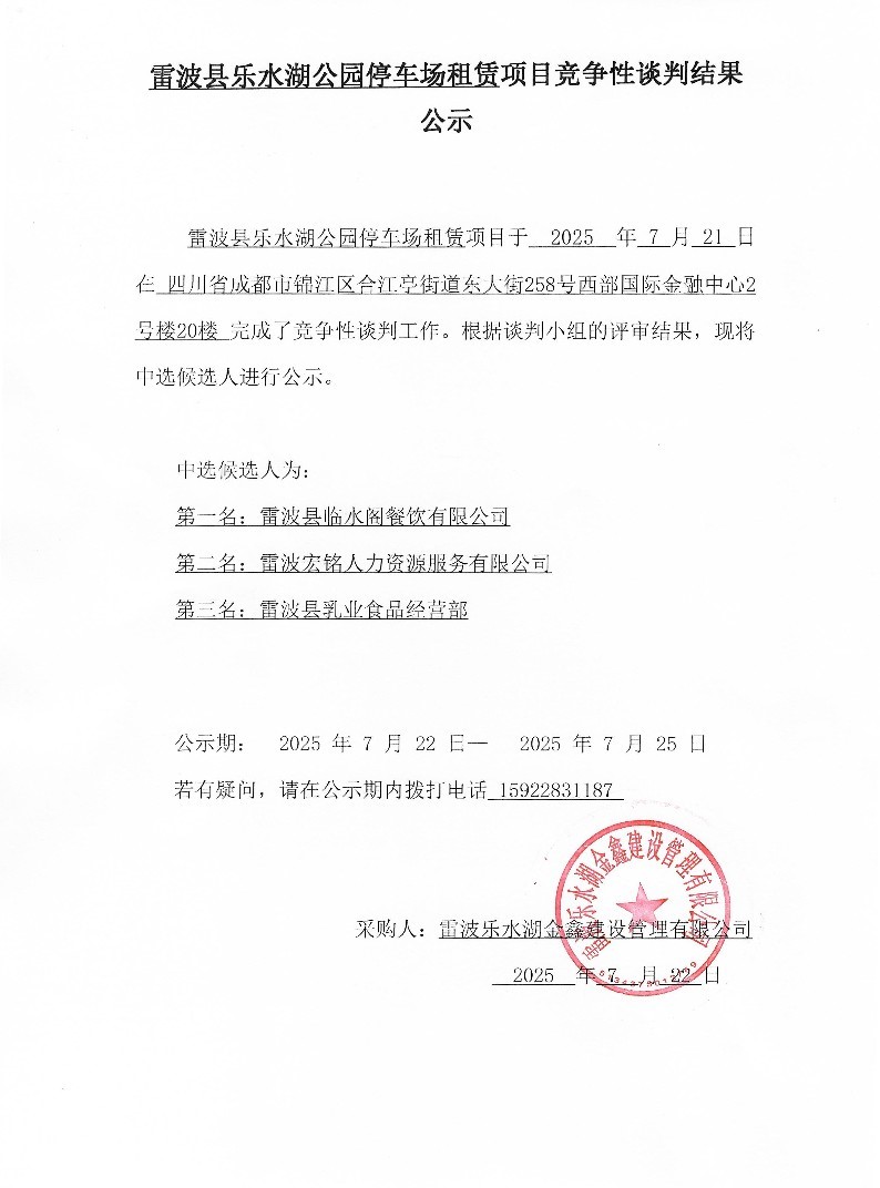 雷波县乐水湖公园停车场租赁项目竞争性谈判结果公示