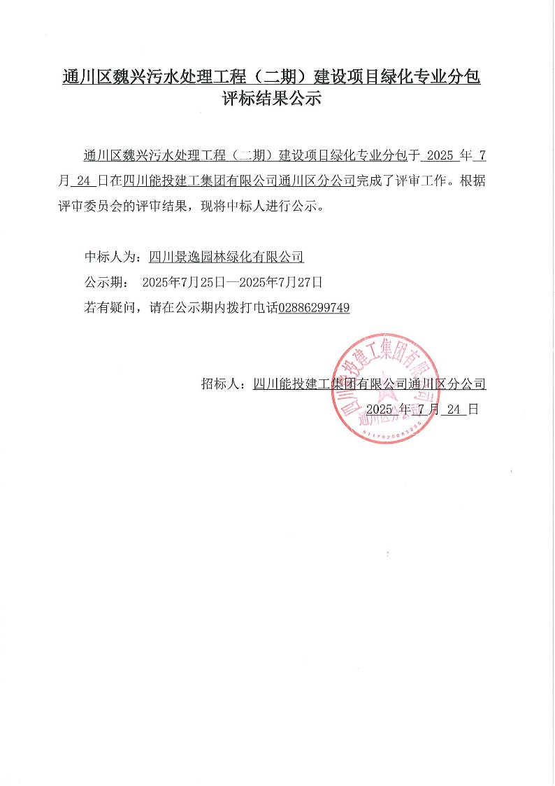 通川区魏兴污水处理工程(二期)建设项目绿化专业分包评标结果公示