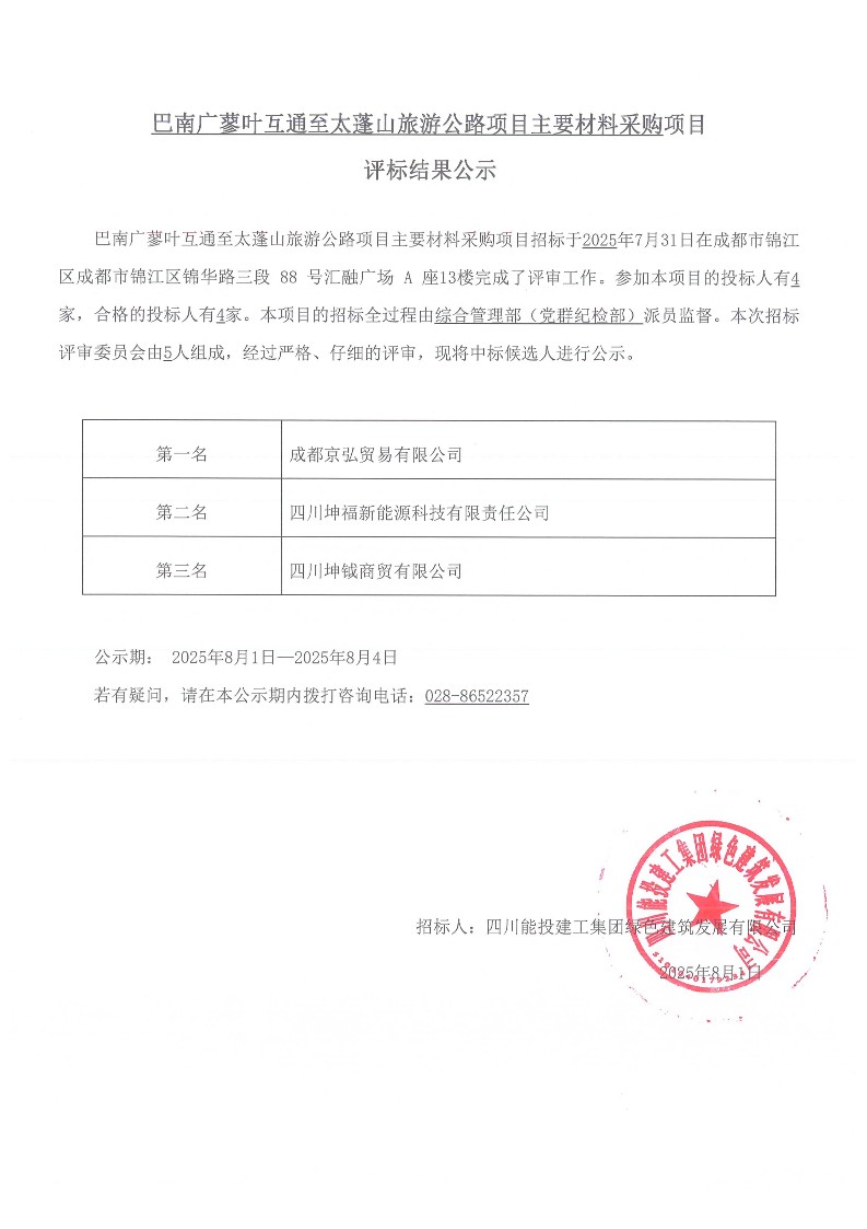 巴南广蓼叶互通至太蓬山旅游公路项目主要材料采购结果公示
