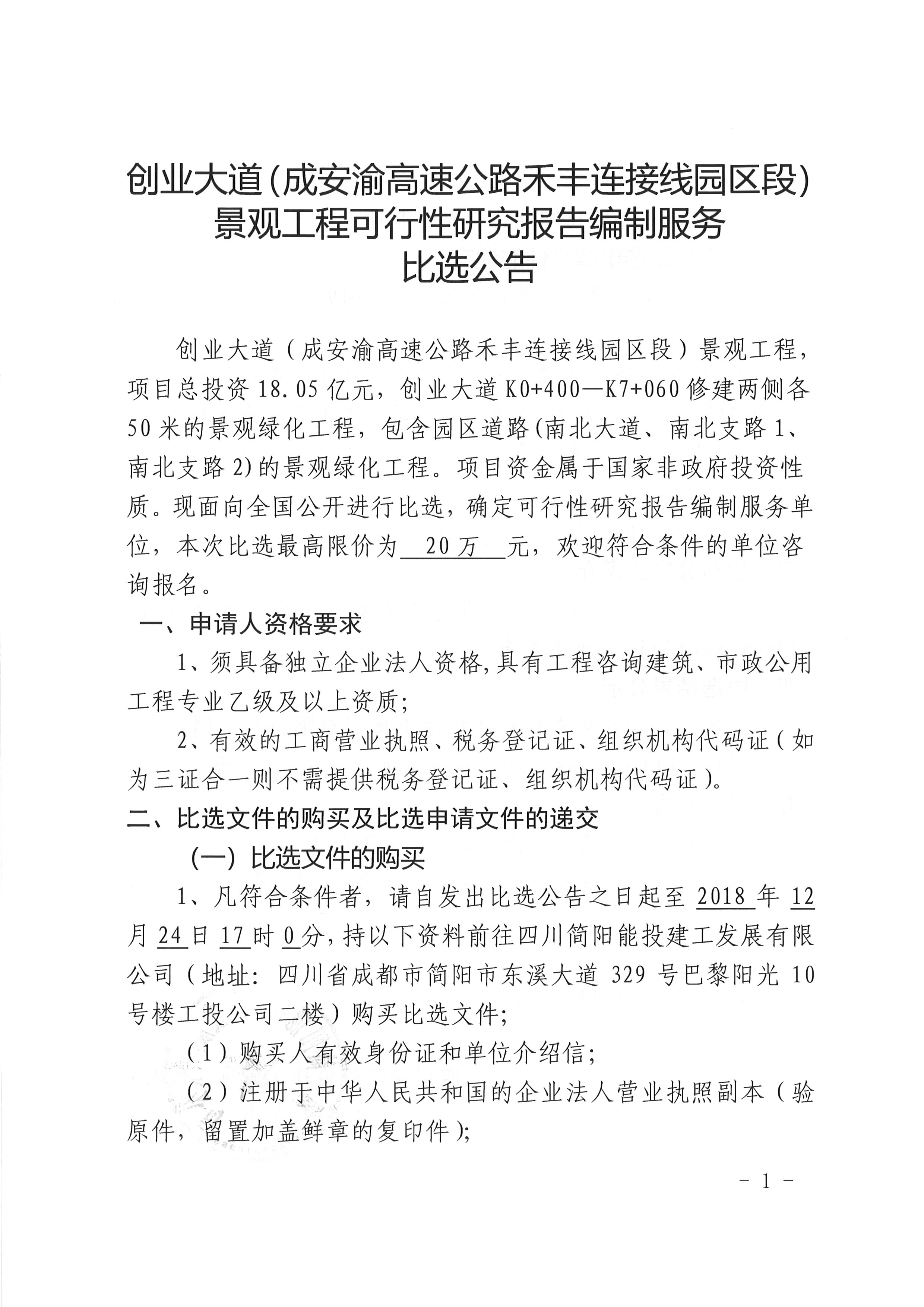 创业大道(成安渝高速公路禾丰连接线园区段)景观工程可行性研究报告编制服务比选公告