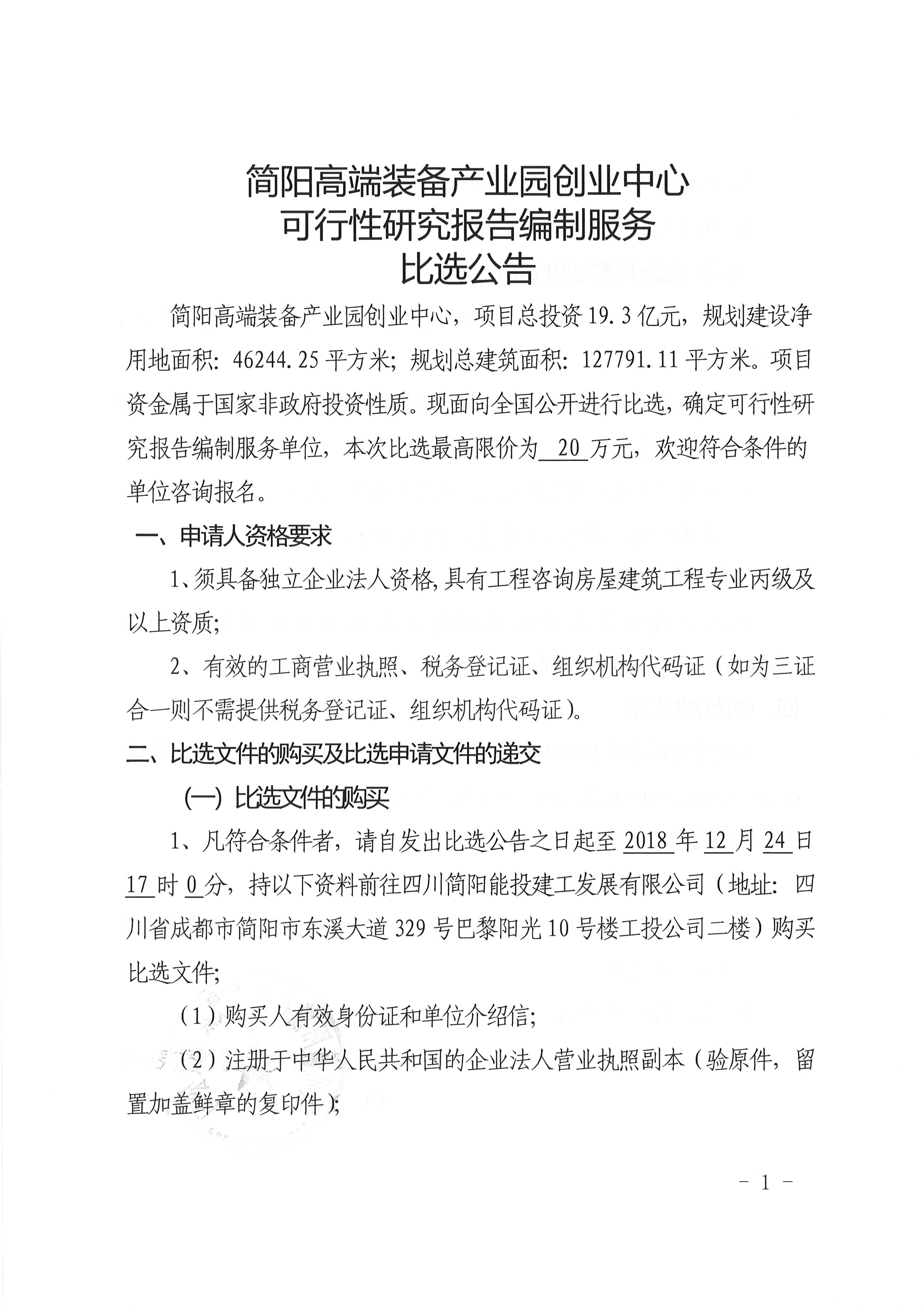简阳高端装备产业园创业中心可行性研究报告编制服务比选公告