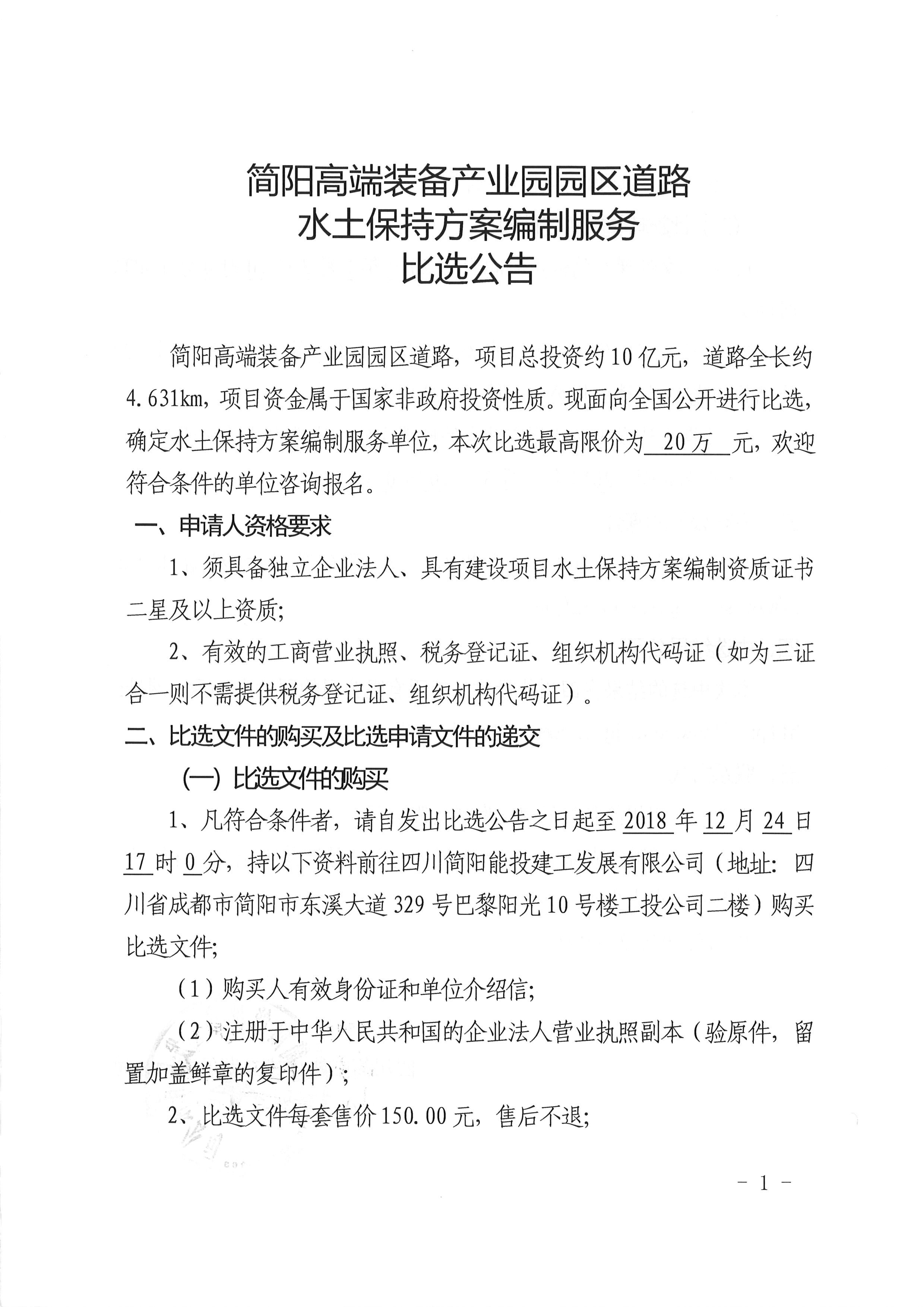 简阳高端装备产业园园区道路水土保持方案编制服务比选公告