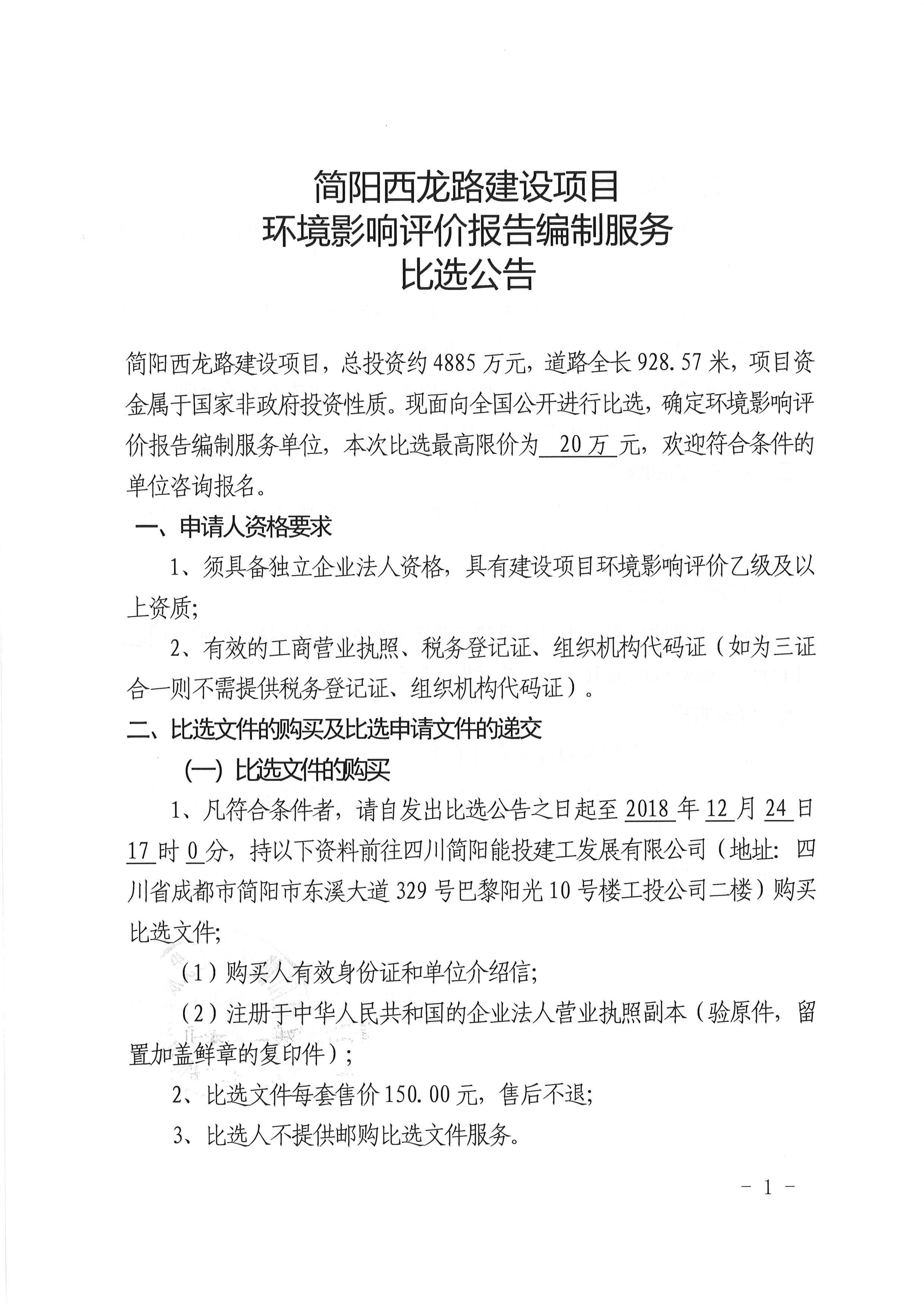 简阳西龙路建设项目环境影响评价报告编制服务比选公告