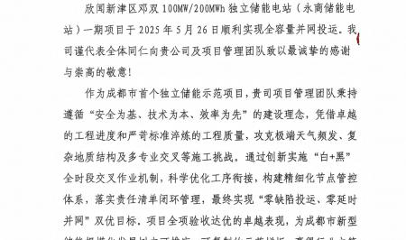 5月30日,四川能投建工集团水利水电工程有限公司收到来自四川能投分布式能源有限公司的感谢信,对其承建的成都市新津区邓双100MW/200MWh独立储能电站(永商储能电站)一期...[详情]